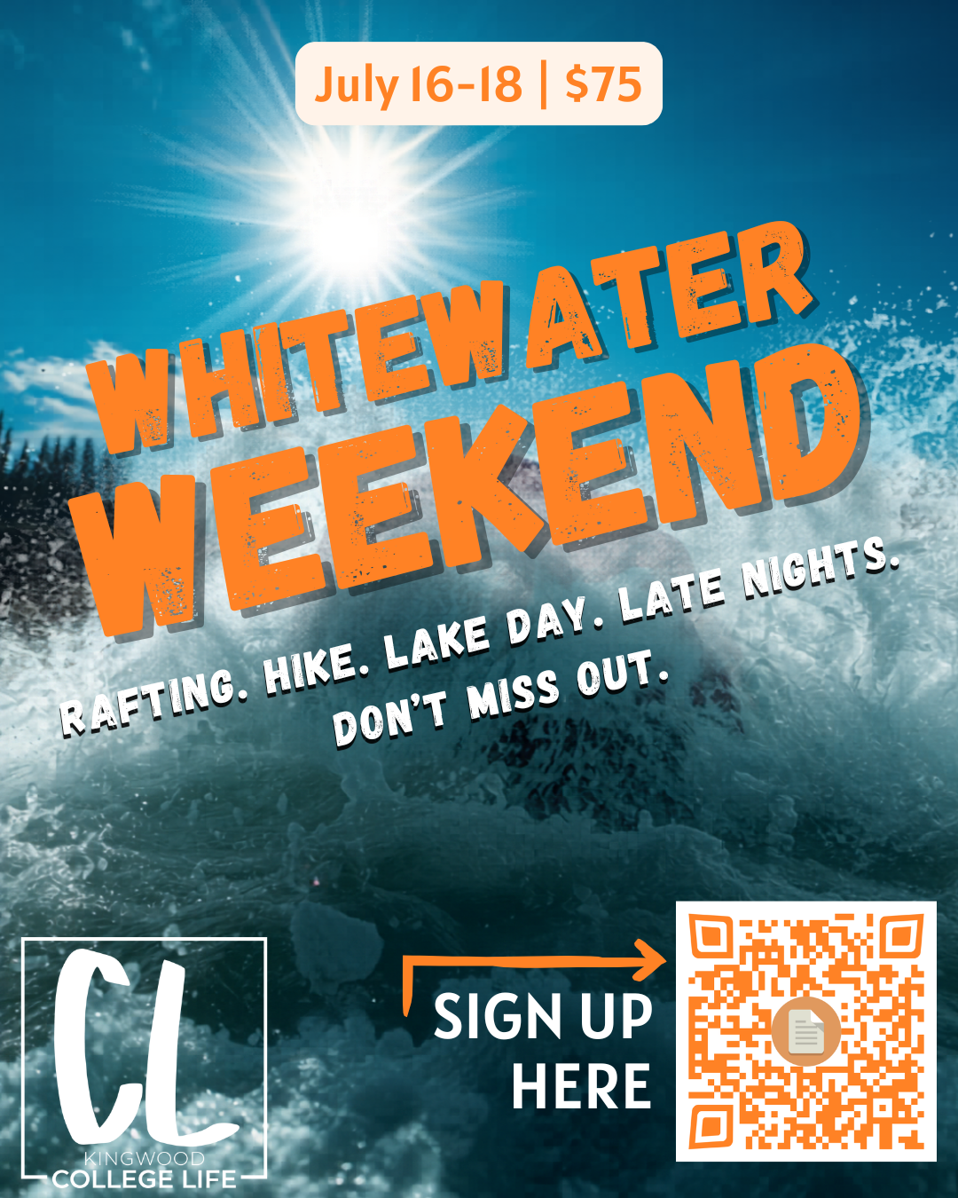 College Life will be taking a summer trip to the Ocoee on July 16-18. The trip will include hiking, an afternoon on the lake, and whitewater rafting! The cost is $75, and the deadline to sign up (to be able to reserve rafting spots) is April 26. If you miss this trip…you will hear about it all fall 😅