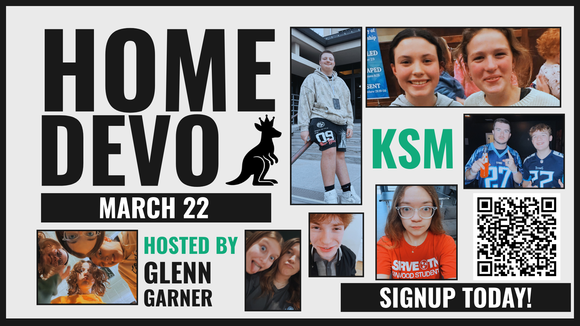 SIGN UP for our March Home Devo. Glenn Garner will be hosting the group. Glenn lives on the other side of town, out past the Barfield area. The church van will be leaving at 4:20 pm on March 22. The devo will be from 5:00-7:30 pm. Please sign up by March 18!
