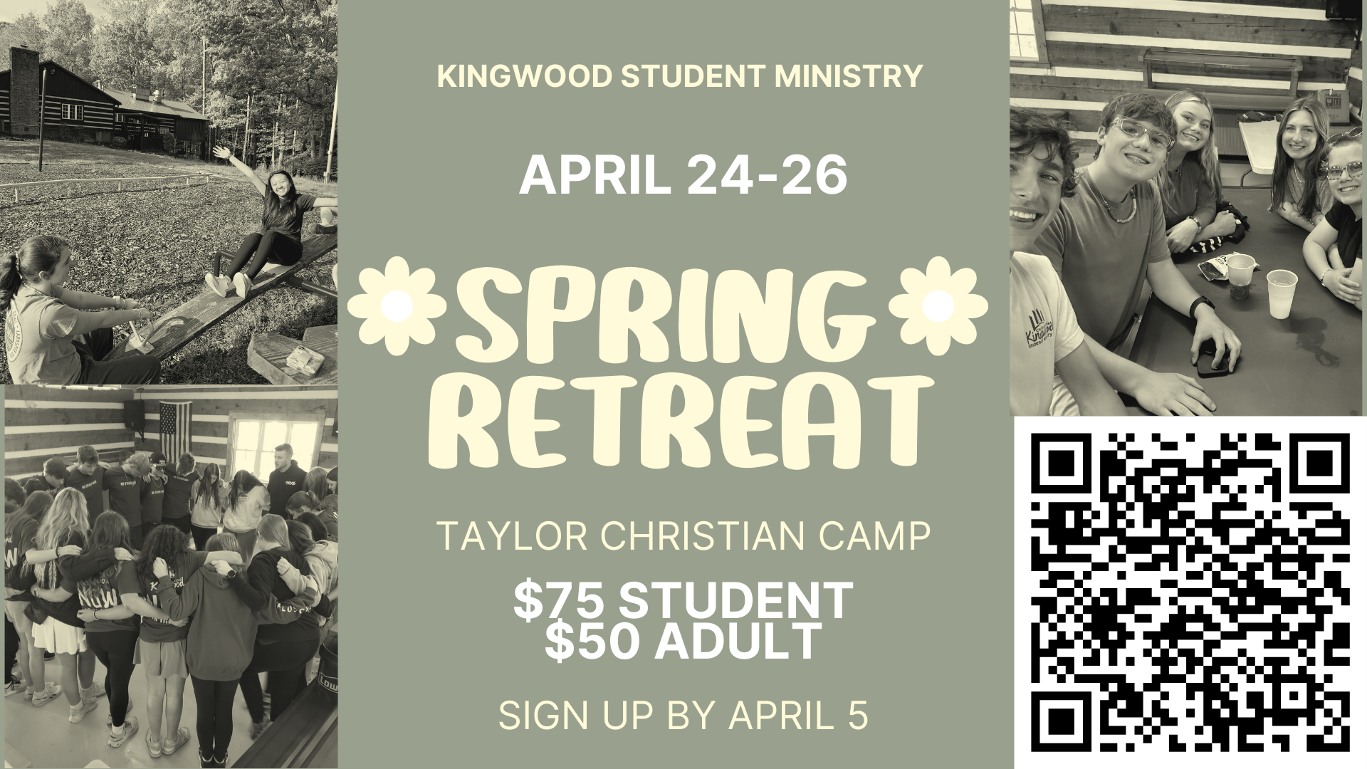 SIGN UP now for our Student Ministry Spring Retreat. The retreat will be Friday April 24 - Sunday April 26. We will be going to Taylor Christian Camp in Holland, KY. The cost is $75 per student and $50 per adult. There is a $25 deposit due when you sign up. Please sign up by April 5!